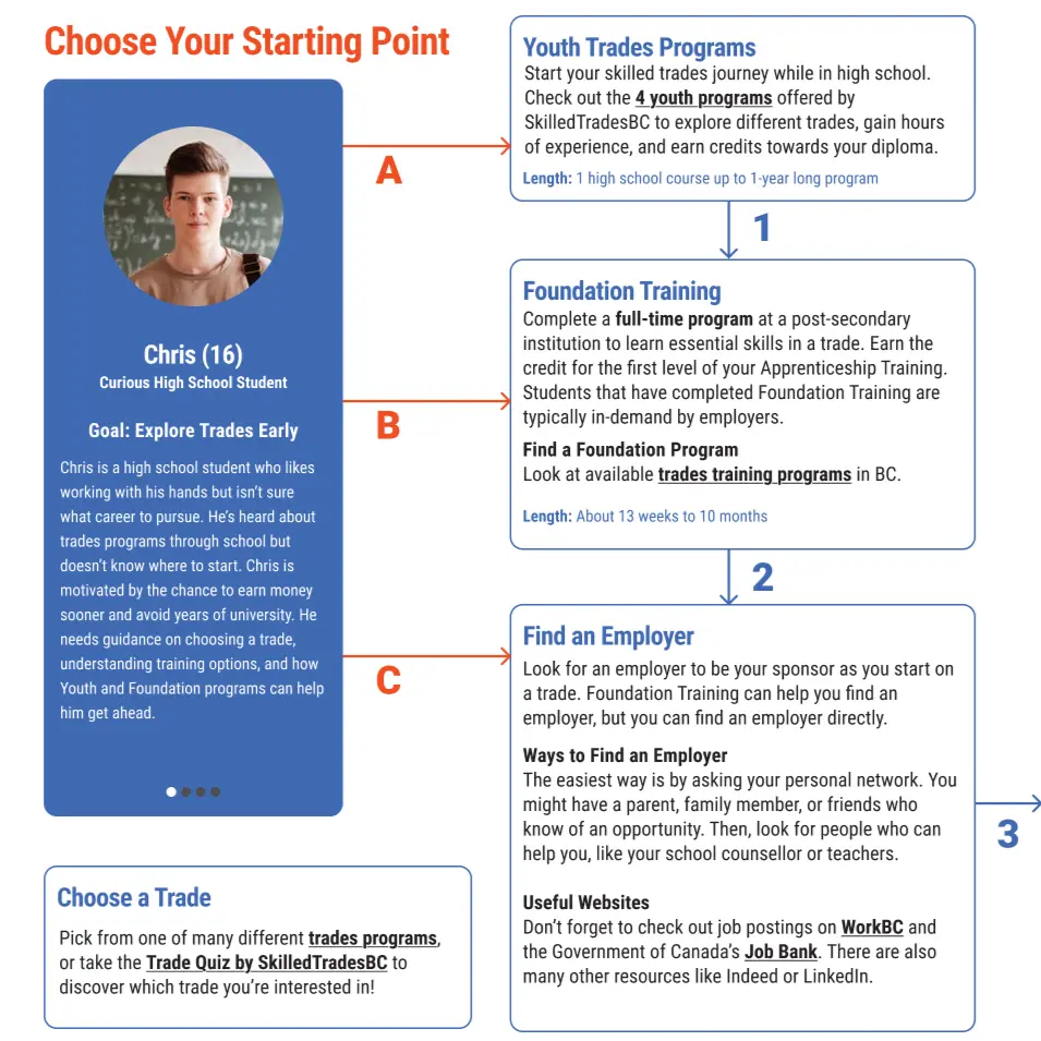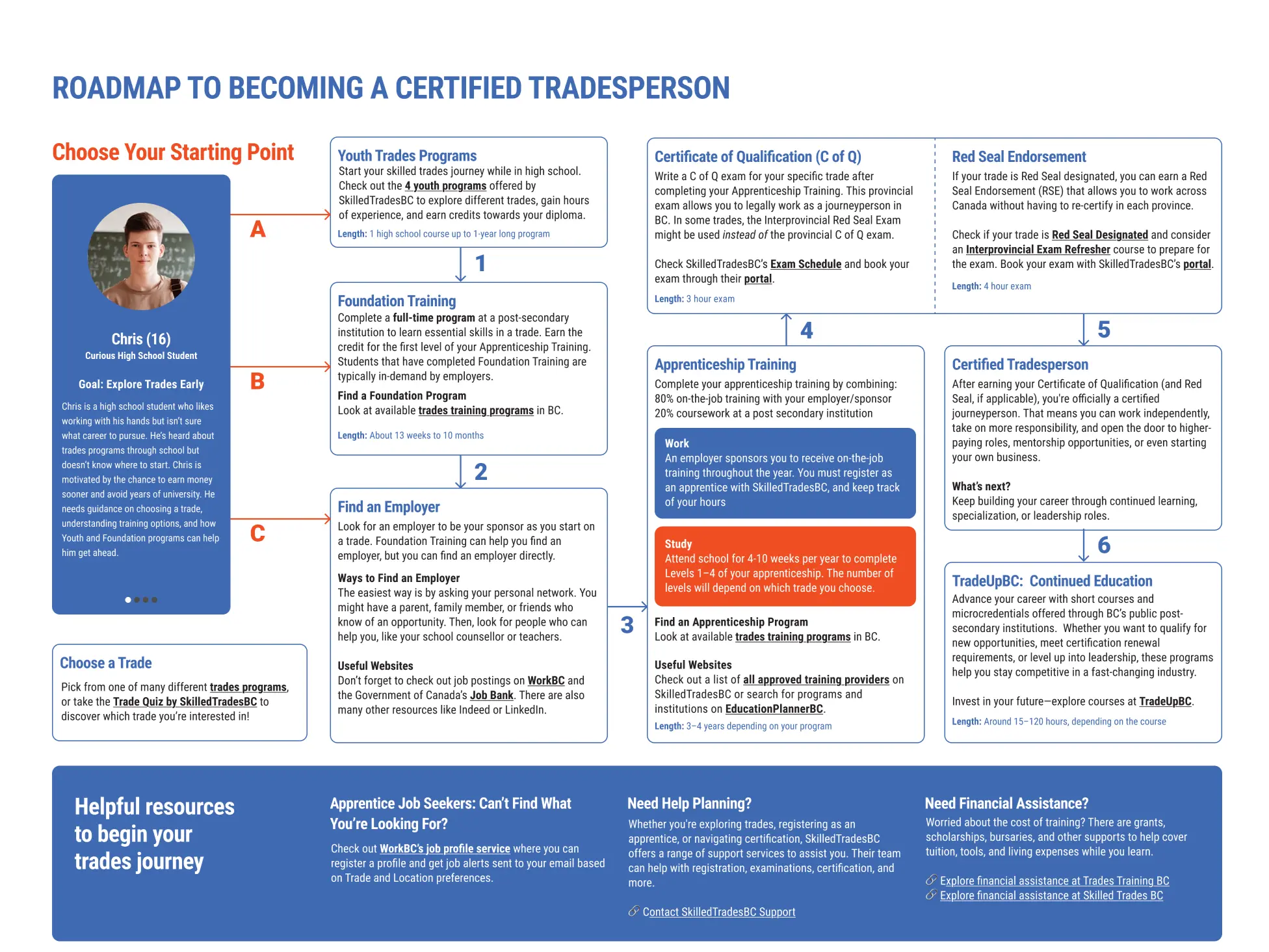 Research revealed that trades pathways vary significantly depending on a user’s background and entry point. These complexities were distilled into a concise journey map that outlines multiple valid starting paths and key decision moments.